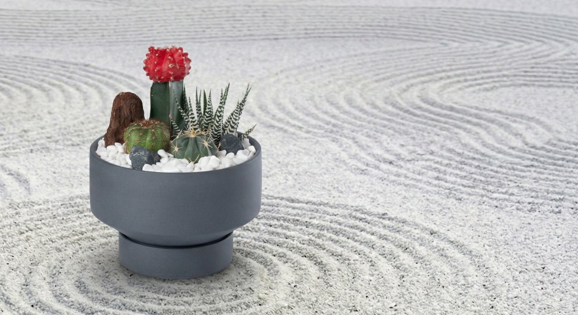 RYOHAKU - りょはく - の「和モダン」では、そんなサボテンの個性を活かしながら、石や白砂を思わせる素材、余白を意識した寄せ植え、空間になじむ落ち着いた鉢のデザインを組み合わせることで、“和モダン”の世界観を表現しました。