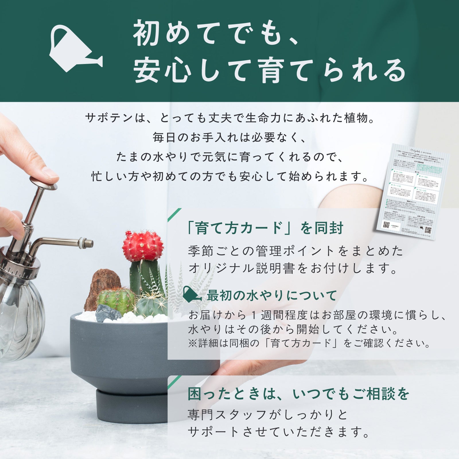 本商品に使用しているサボテンは、水やりの頻度が少なく、比較的育てやすい植物です。日々忙しい方でも、無理なく取り入れることができます。