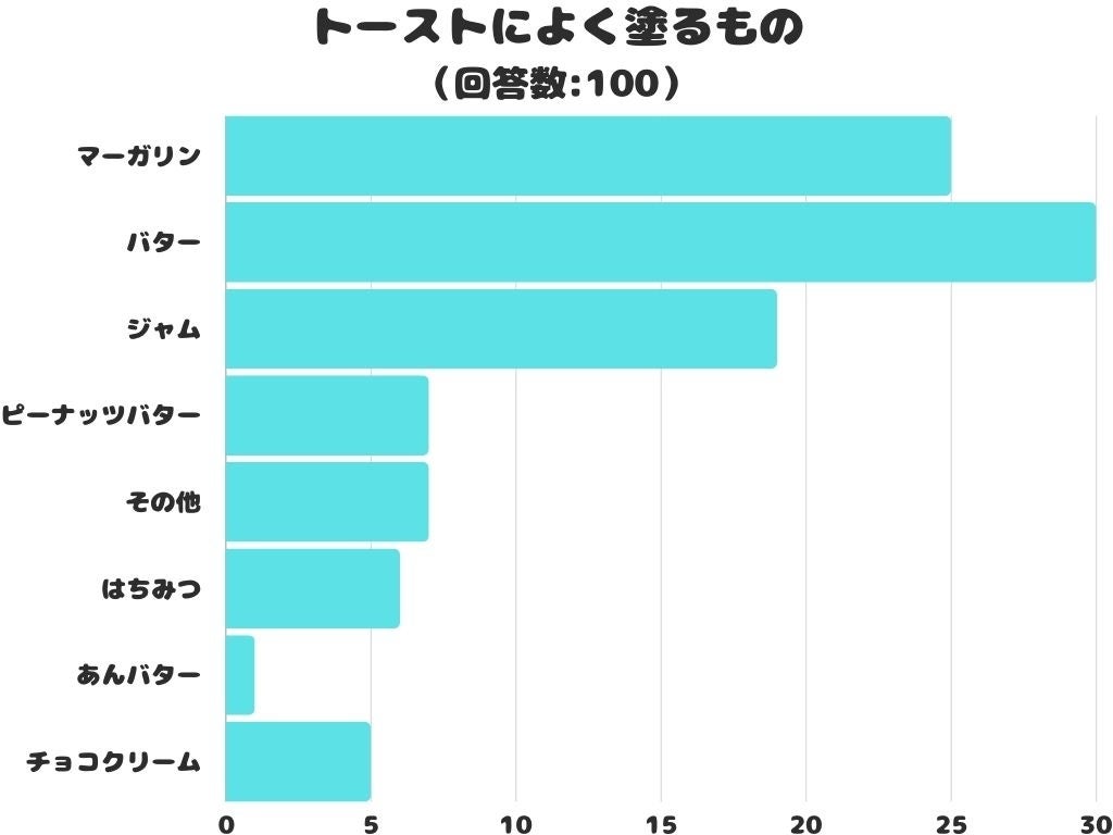 トーストによく塗るものをアンケートにて調査したところ、1位は「バター」でした。