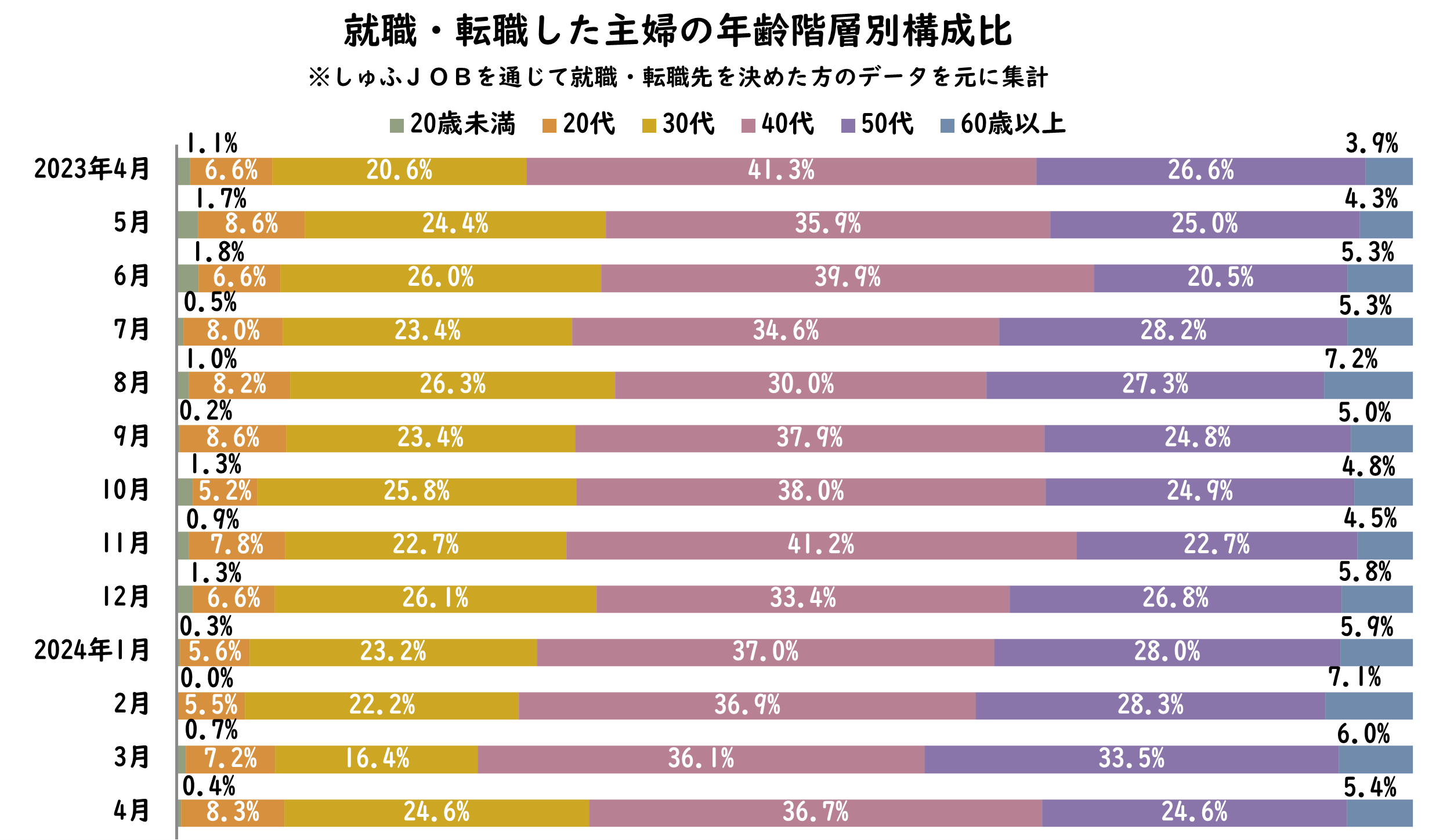 転職しゅふの平均年齢は、前月比-1.8歳、前年同月比-0.4歳の44.0歳。
