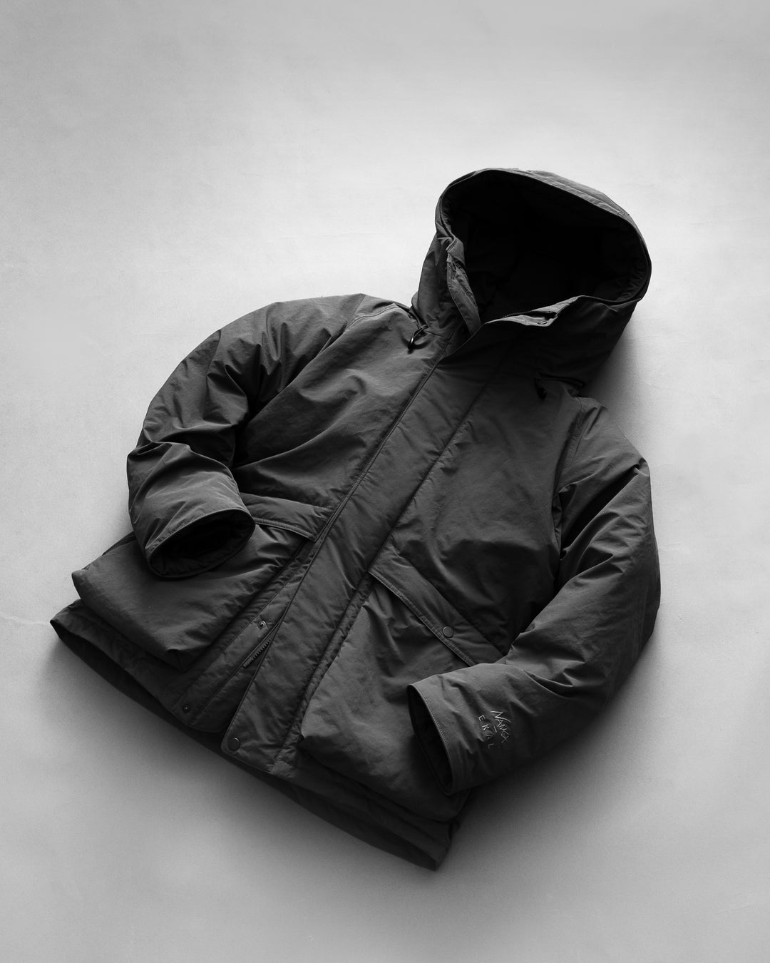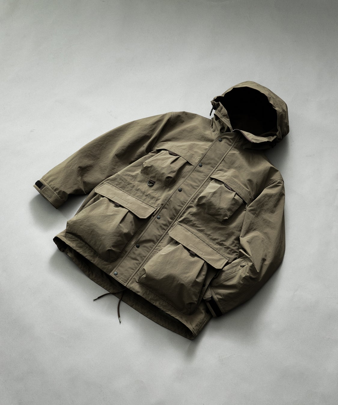 ネックは高めのスタンドカラーでネック全体を覆う事が可能。フードにはゴムスピンドルが入っているのでフィット感 の調整が可能となっています。胸、ウエスト部分のポケットはダーツとタックで立体的な仕様に。ギアやガジェットなど、大容量に収納できます。左袖口にもコンシールポケットを配置しているのでカードや小物を入れるのに便利です。内側のセンターネック部分には別売りのダウンカーディガンをワンタッチで脱着することのできるテープを配置しており、レイヤリングすることで衣服内温度を調整することができる汎用性を持った仕様です。ウエストと裾にはスピンドルを通すことによってシルエットを変化させることができます。フード後ろにもサイズ調整用のアジャスターがあることにより、フード口周囲だけではなく全体のフィット感を高めることが可能です。