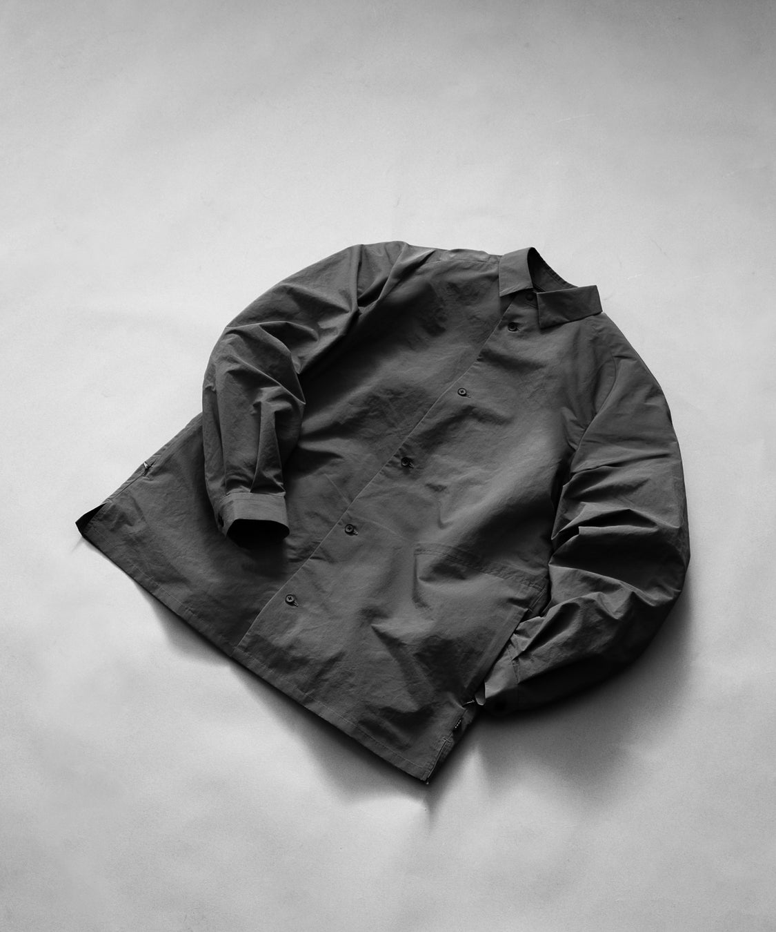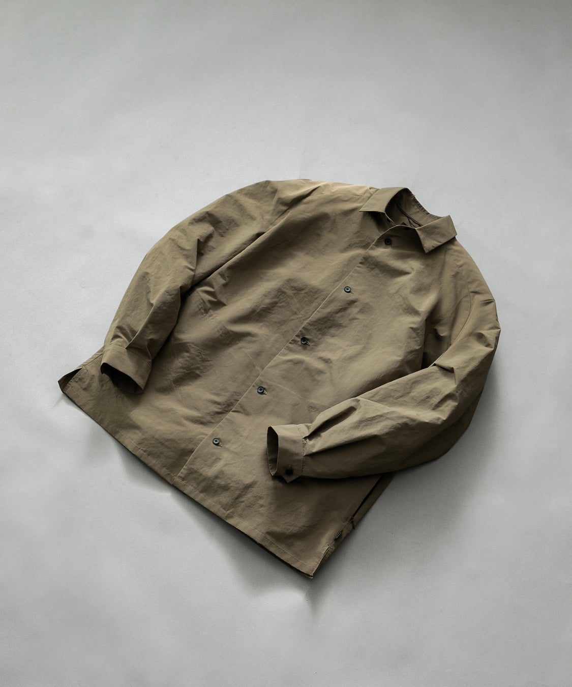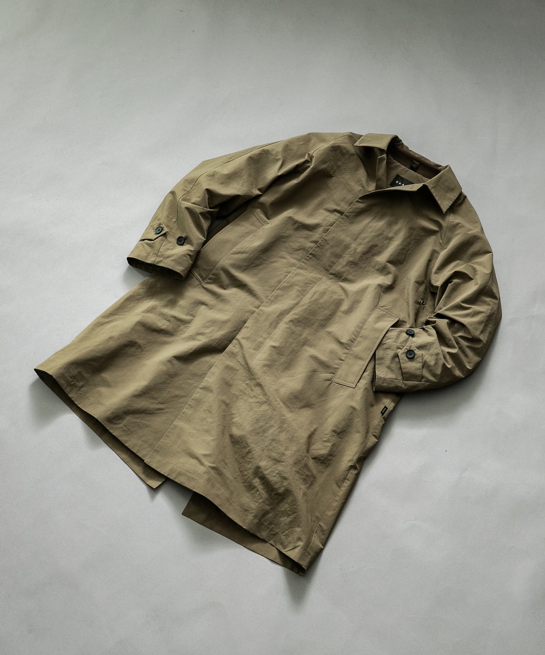 独特な肌触りとしっとりとした質感の素材。ボタンはマットなラバーコーティングボタンを使用。小ぶりなサイズなので止めやすくシンプルな表情をキープしています。腕周りは袖の可動域を確保したラグランスリーブ仕様。カフスにはアジャスト用のボタンでサイズ調整可能。ネックにはEKALオリジナルのミックスコード、グログランテープをネックラインに流し込んで細部までこだわった仕様になっています。