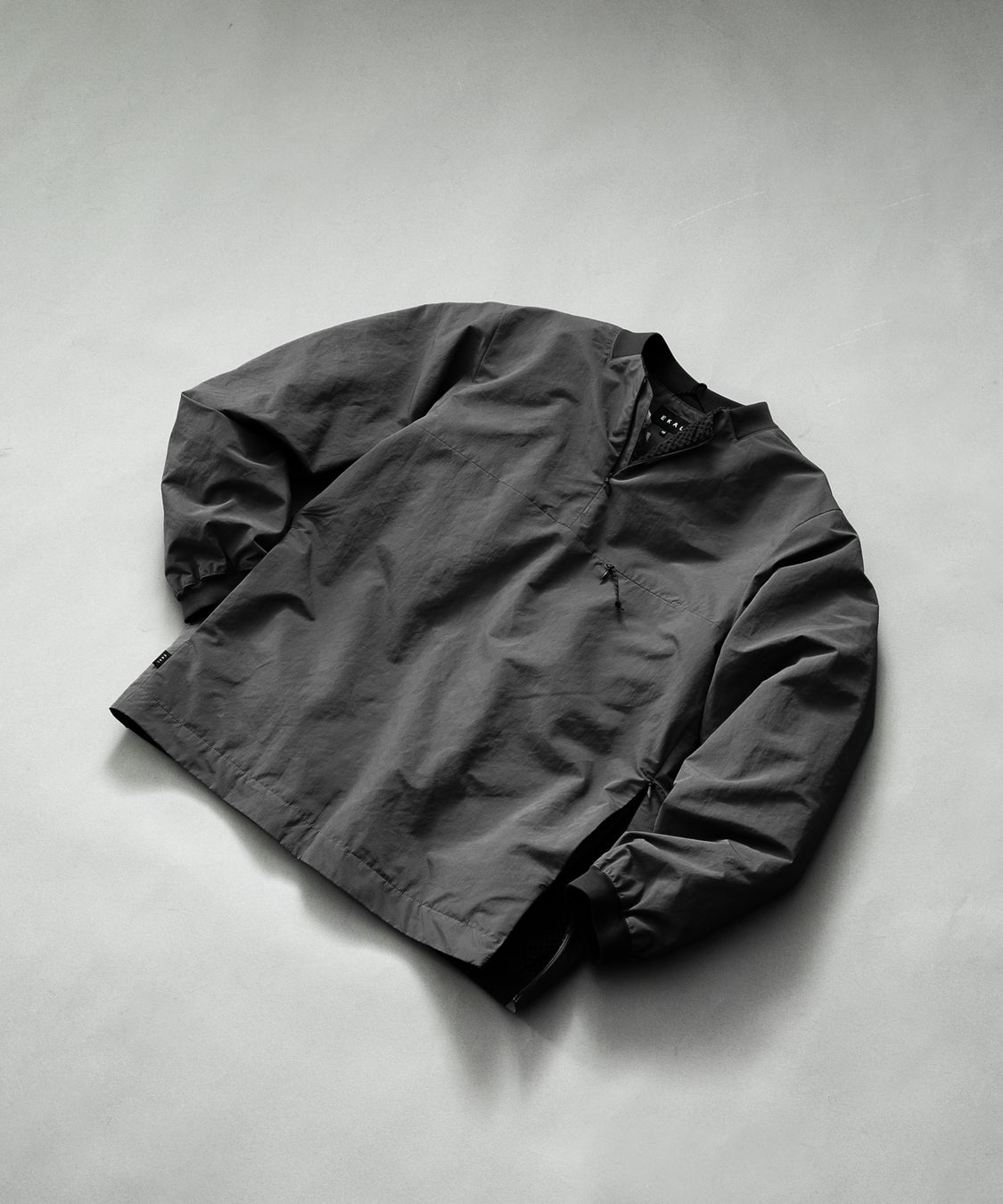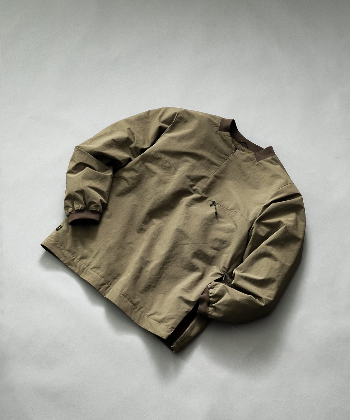 左脇にもZIPを設けて着脱時のしやすさを助けると同時にベンチレーションとしての役割も兼ね備えた仕様。袖口、後ろ裾には別布のジャージ素材を使用することにより余計な外気の侵入を防いでいます。