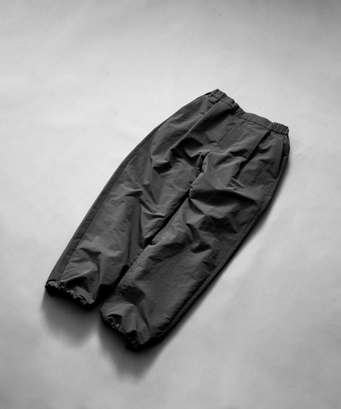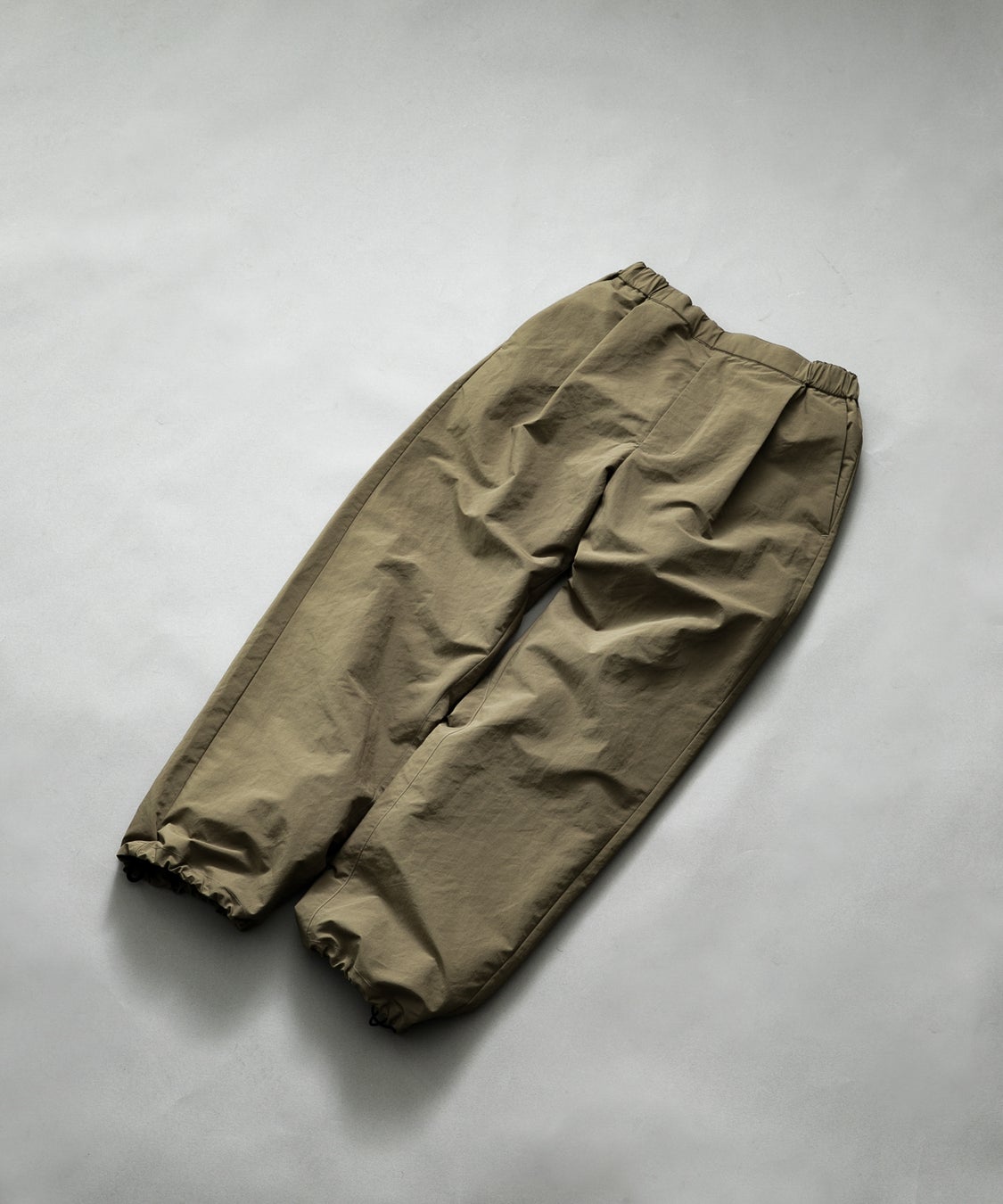 ウエスト~ヒップ周りに深めのタックを取ってゆとりを持たせており、程よくルーズフィット感のあるシルエット。フロントはステッチレスなミニマムな表情に。裾はゴムスピンドルを通してシルエットを変化させたり、たくしあげたりする際に便利な仕様。左後ろポケットはスマホなどを入れるのに便利なサイズで脇線へ極力近づけることにより、椅子などに座った時に身体に干渉 しないような設計に。右後ろポケットは大容量のマチ付きポケットになっているのでシーンによって様々なものを入れて使用することが出来ます。