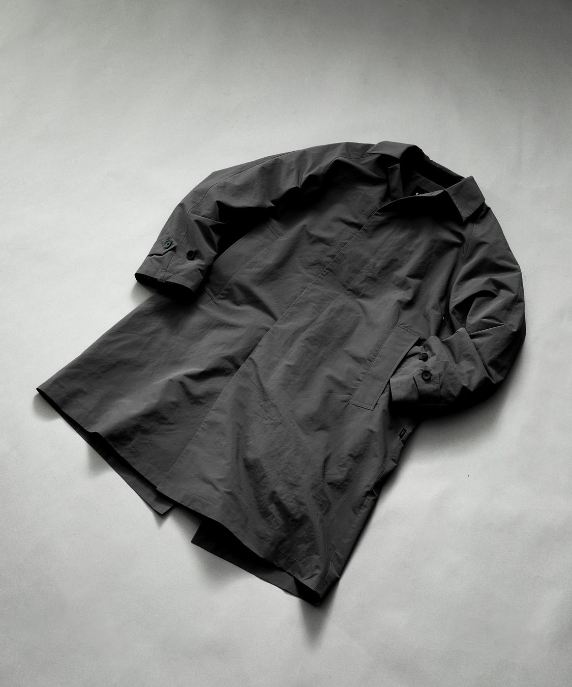 ウエストから下部分はポリエステルタフタ素材。(総裏仕様)内側の仕様も美しく仕立てられた長く着ていただくことを考えて作られた普遍的なコートながらも機能素材を裏地に使用することによってモダンに仕上がりになっています。内側のセンターネック部分には別売りのダウンカーディガンをワンタッチで脱着することのできるテープを配置しており、レイヤリングすることで衣服内温度を調整することができる汎用性を持った仕様。また、胸部分にはファスナーポケットを配置。表面はステッチレスな襟でミニマムでクリーンな表情に。少し深めの重なりを持たせたセンターフロント。 比翼仕立ての前立て。後ろのセンターベンツにはボタンがあるので開き具合を調整できます。