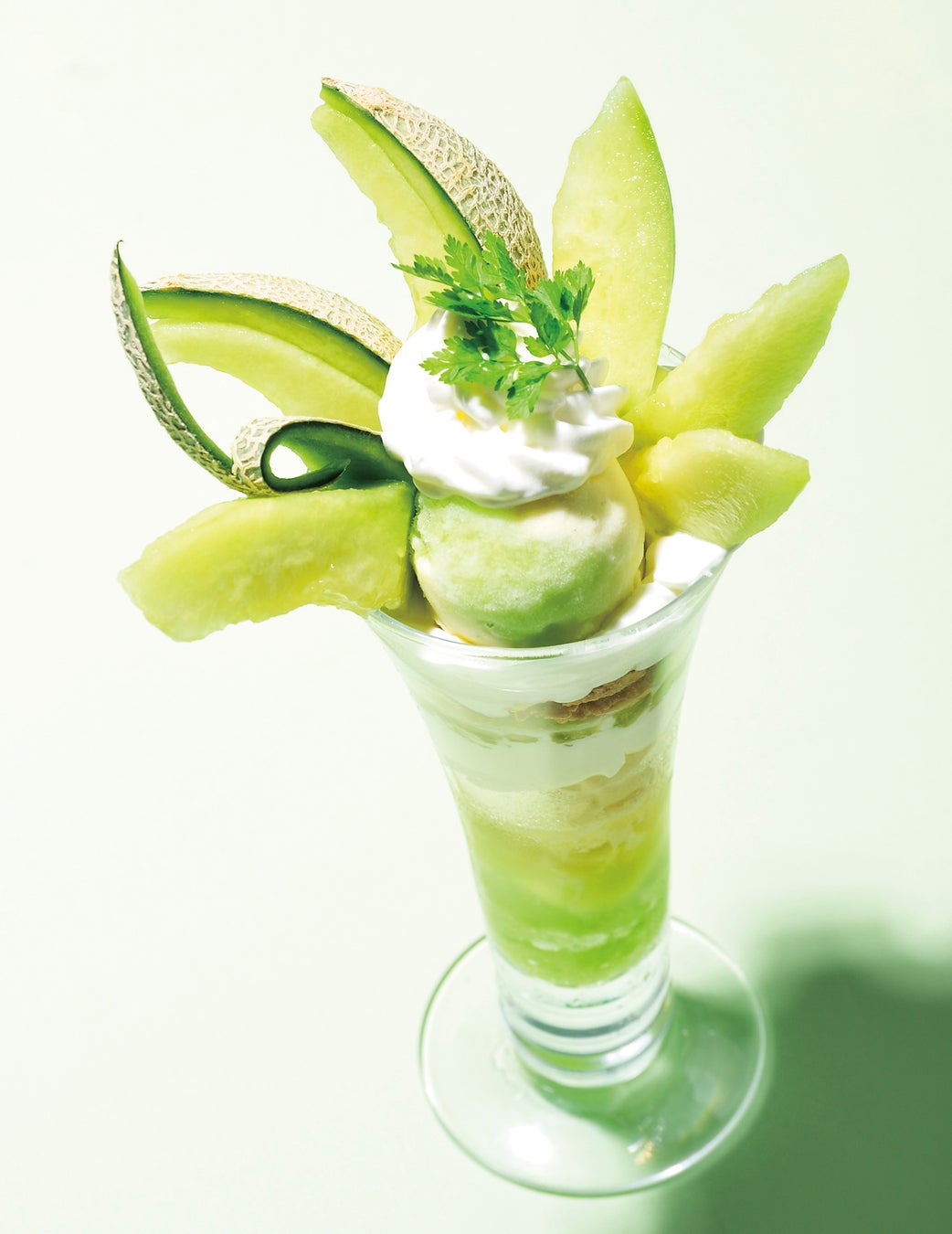 「茨城県産メロンのパフェ」はメロンのみずみずしい果肉を贅沢に盛り、自家製メロングラニテ(※)とバニラアイス&生クリームを組み合わせました。
