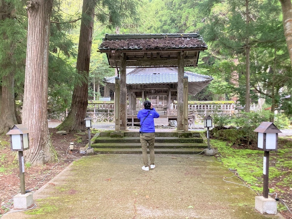 (左)南丹地域をリサーチするヤマガミ氏(撮影地:知井八幡神社)