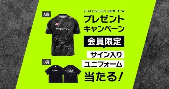 株式会社ジェーシービー (本社:東京都港区、代表取締役兼執行役員社長:二重 孝好、以下:JCB)は、2024年2 月1 日(木)より、e スポーツチーム「ZETA DIVISION」とコラボレーションしたオリジナル券面「ZETA DIVISIONJCB カード W」の会員様を対象として、サイン入りユニフォームが抽選で当たるキャンペーンを開始します。