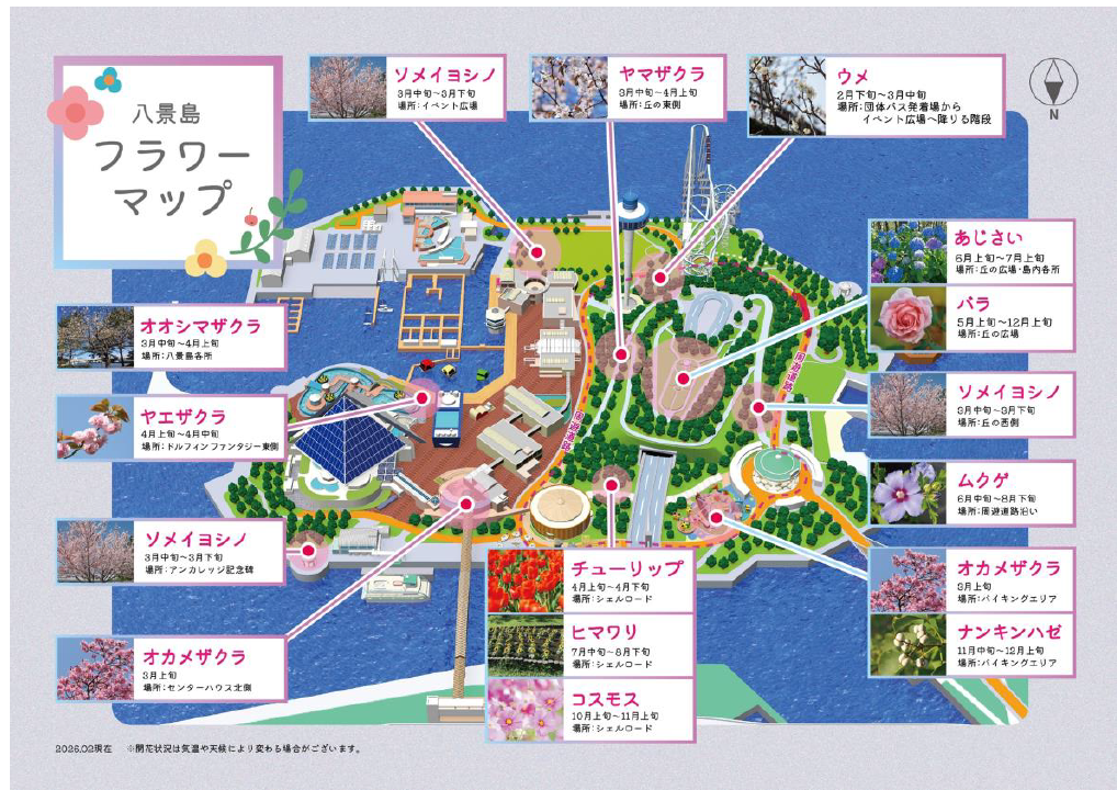 3~4月に5種700本の桜、5~6月には約100種500株のバラや県内最大級を誇る2万株のあじさいが咲き誇り、八景島全体が色彩豊かな花の島となります。