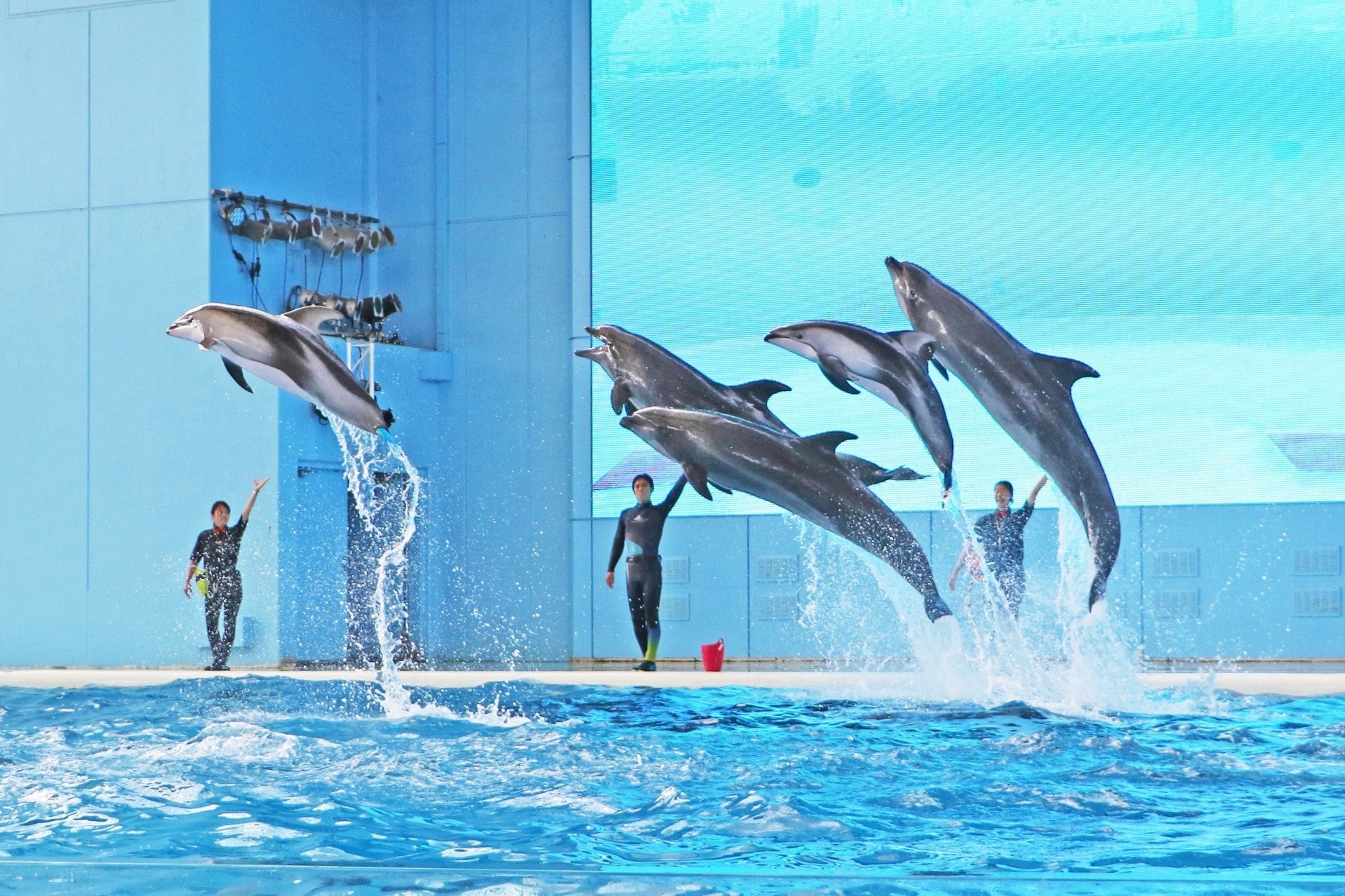 水族館「アクアミュージアム」4Fライブスタジアムで開催している「Animal Life Live!」では、 パフォーマンス時に生きものたちのリアルな動きや 躍動を体感していただくことで、自然環境や生きものたちの未来を考えていただくきっかけを提供しております。パフォーマンス中では、スタジアム上部に設置している噴水から降り注ぐ水の演出とイルカたちとのコラボレーションをはじめ、お客さま参加型に よるセイウチの生態クイズ、バンドウイルカやカマイルカによるダイナミックなジャンプ、シロイルカによる優雅な水中パフォーマンスなどをご覧いただけます。