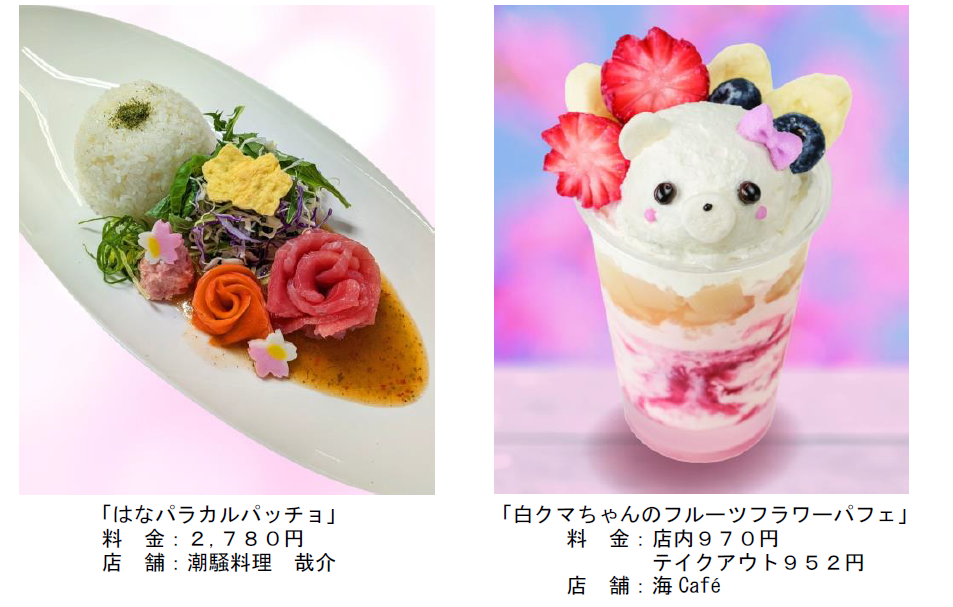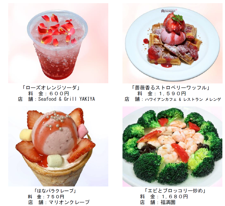 5月29日(金)までの期間中、島内のレストランや軽飲食店舗では、見た目も華やかな フードメニューをご用意いたします。春をイメージした「はなパラクレープ」や、バラをモチーフにした「薔薇香るストロベリーワッフル」など、期間限定のフードやドリンクで春のお花見シーズンをお楽しみいただけます。