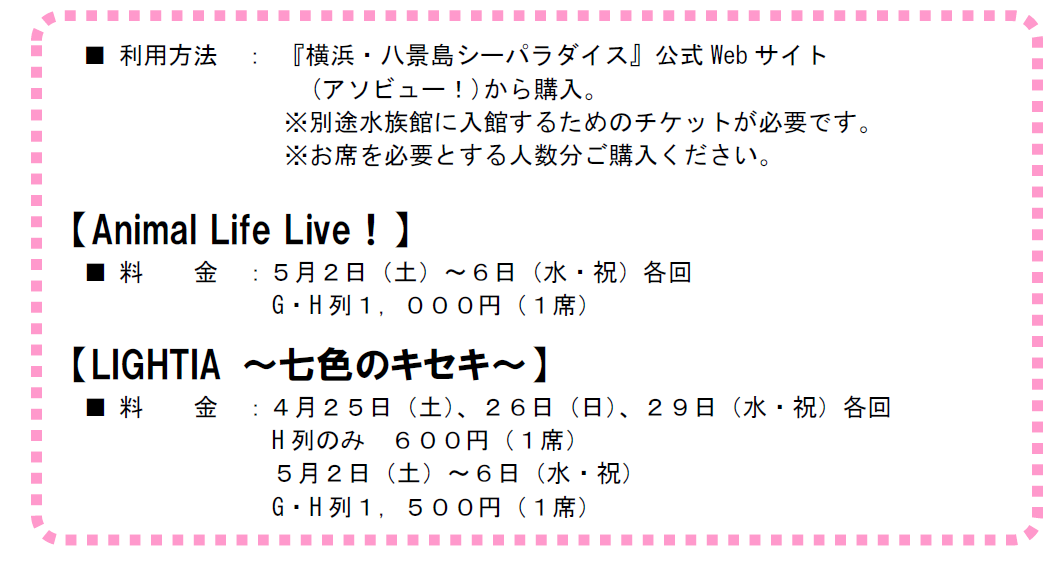 横浜・八景島シーパラダイス』では、人気のパフォーマンス「Animal Life Live!」と ナイトパフォーマンス「LIGHTIA~七色のキセキ~」の観覧席を確保できるチケットを席数限定で販売しております。混雑時も安心してパフォーマンスをお楽しみいただけます。