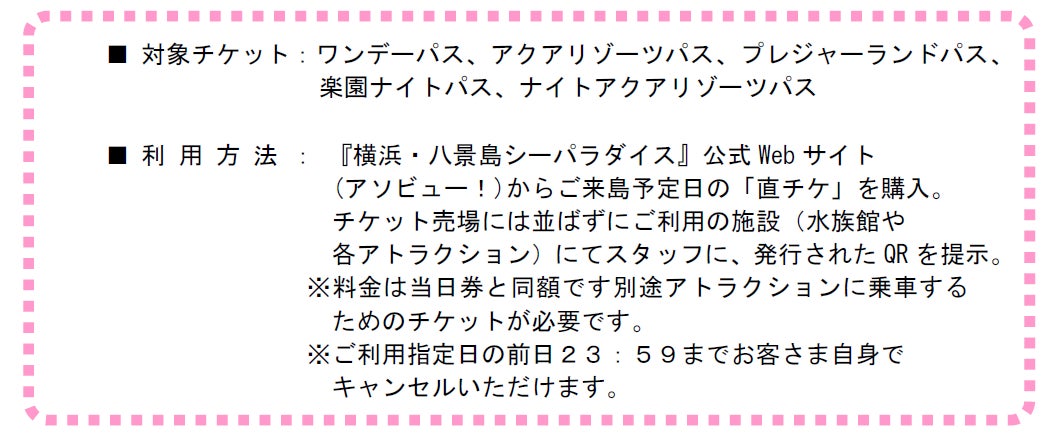 『横浜・八景島シーパラダイス』では、スマホでチケットが表示できる電子チケット「直チケ」を販売しております。事前に購入することでチケット売場に並ぶ必要なく、すぐに水族館・アトラクションをお楽しみいただけます。