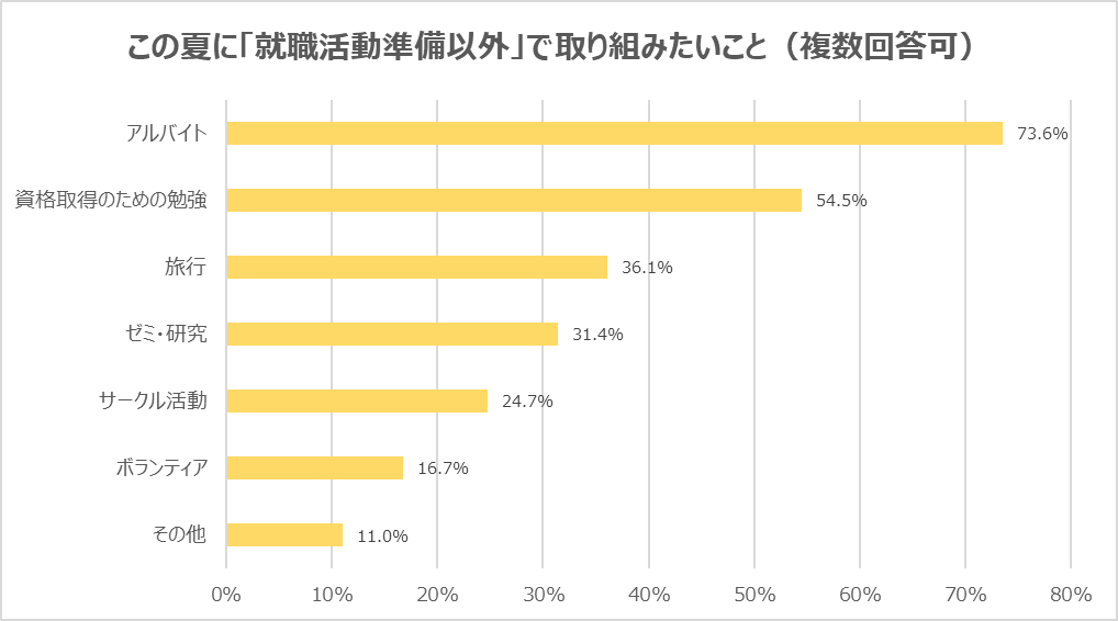 この夏に「就職活動準備以外」で取り組みたいことは、「アルバイト」が73.6%で最多。次いで、「資格取得のための勉強」54.5%が続きました。「就職活動につながるアルバイトをしたい」「学生で時間があるうちに旅行にも行きたいので、アルバイトをして旅行に行きたい」などの声が寄せられています。