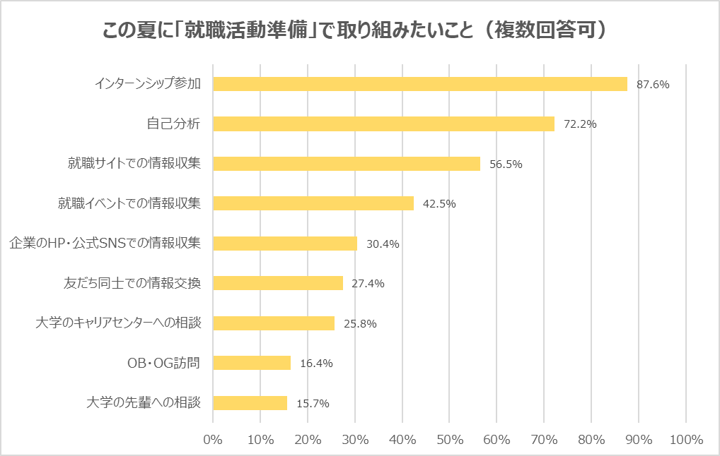 この夏に「就職活動準備」で取り組みたいことは、「インターンシップ参加」が87.6%で最多。次いで、「自己分析」72.2%、「就職サイトでの情報収集」56.5%、「就職イベントでの情報収集」42.5%が続きました。「インターンシップの参加を通して、適性を知りたい」「複数の業界のインターンシップに参加し、夏休みのうちに業界を絞りたい」「夏休み中に多くの企業と接点を持てれば、就職活動を有利に進めることができると思う」などの声が寄せられました。