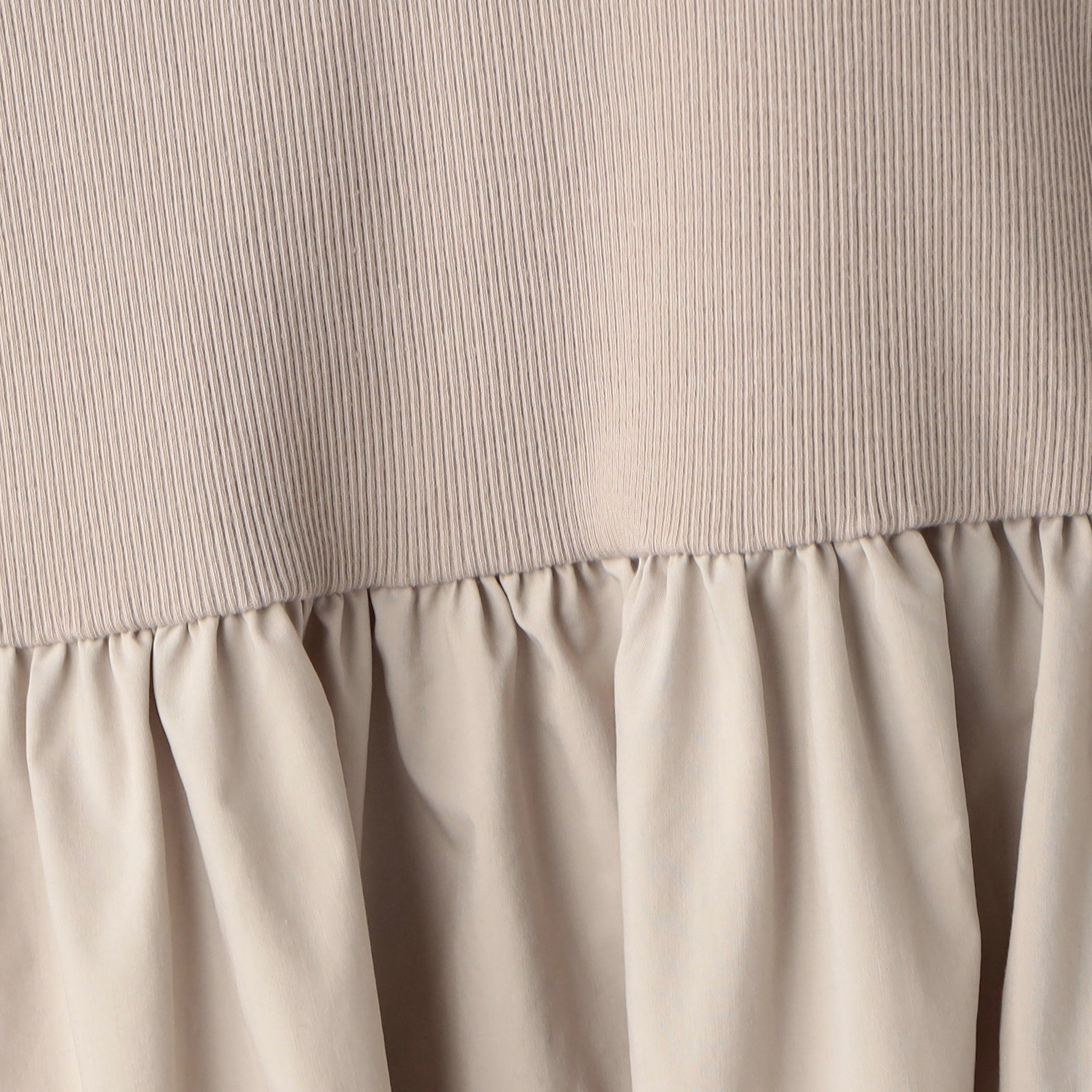・スカートと袖には、高い伸縮性を持つポリエステル系の複合繊維を使用しました。薄手でハリ感のある素材なので、ギャザーが立体的に仕上がっています。さらりとしたタッチで、上質感のある素材です。
