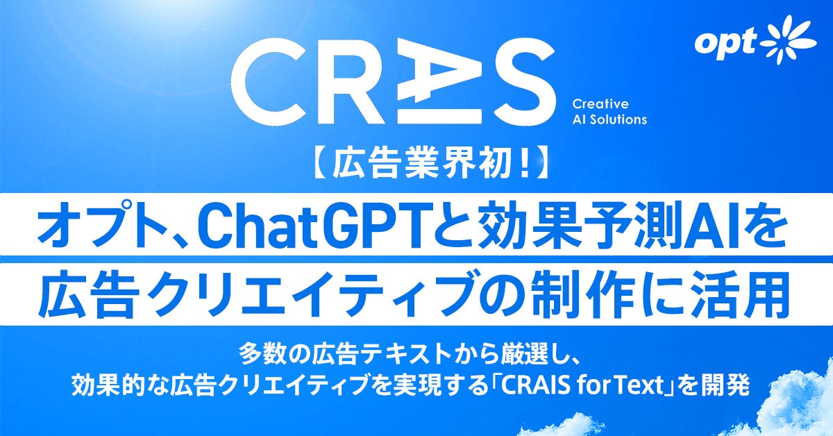 「デジタルで、この国の新しい基本をつくる。」をミッションに掲げ、顧客の事業成長に伴走する株式会社オプト(本社:東京都千代田区、代表取締役社長 CEO:栗本 聖也、以下、オプト)は、ChatGPT(※1)と効果予測AIを活用し、多数の広告テキストから厳選することで効果的な広告クリエイティブを実現する「CRAIS for Text」を開発いたしました。なお、本件は広告業界初(※2)の取り組みです。