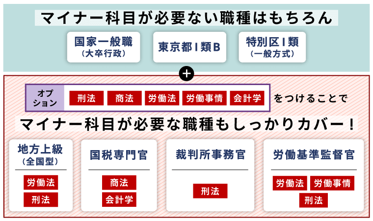 国家一般職(大卒行政)、東京都Ⅰ類B、特別区Ⅰ類(一般方式)はもちろん、地方上級(全国型)、国税専門官、裁判所事務官、労働基準監督官にも対応できるカリキュラム構成です。