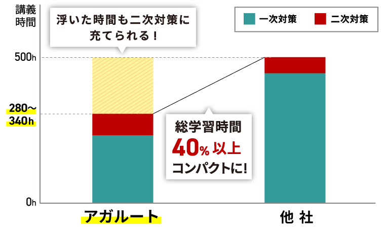 他社では500時間以上の講義が必要なところ、アガルートは幅広い自治体に対応するための豊富な科目数や民間就職のための講座がありながら、約280~340時間とコンパクトにおさえています。