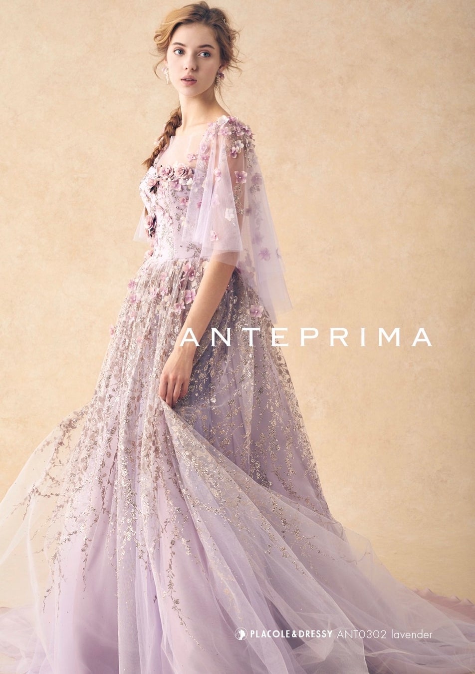 フェミニン過ぎないアンテプリマの大人ラベンダーカラーは、甘さが苦手な花嫁にもおすすです。透明感あるヨークやケープは取り外しが可能で、ビスチェドレスとしても楽しめます。