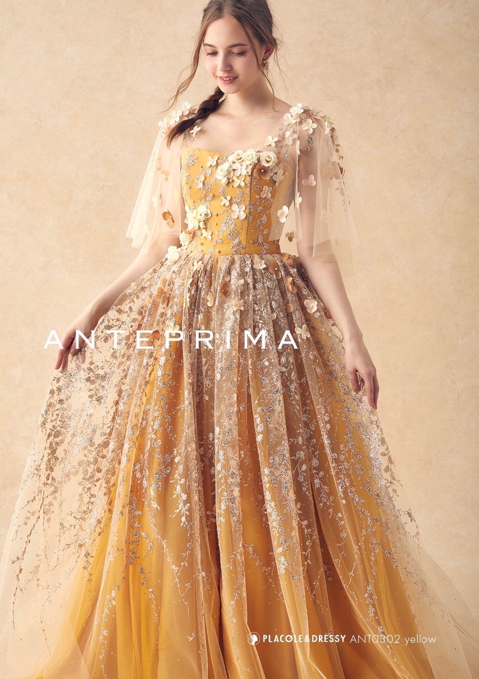 プラコレこだわりの紅茶(CHEERZ)をイメージしたシャンパンイエローのお花ドレスは、アンテプリマらしいハッピー感溢れる花嫁姿を実現させます。透明感あるヨークやケープは取り外しが可能で、ビスチェドレスとしても楽しめます。