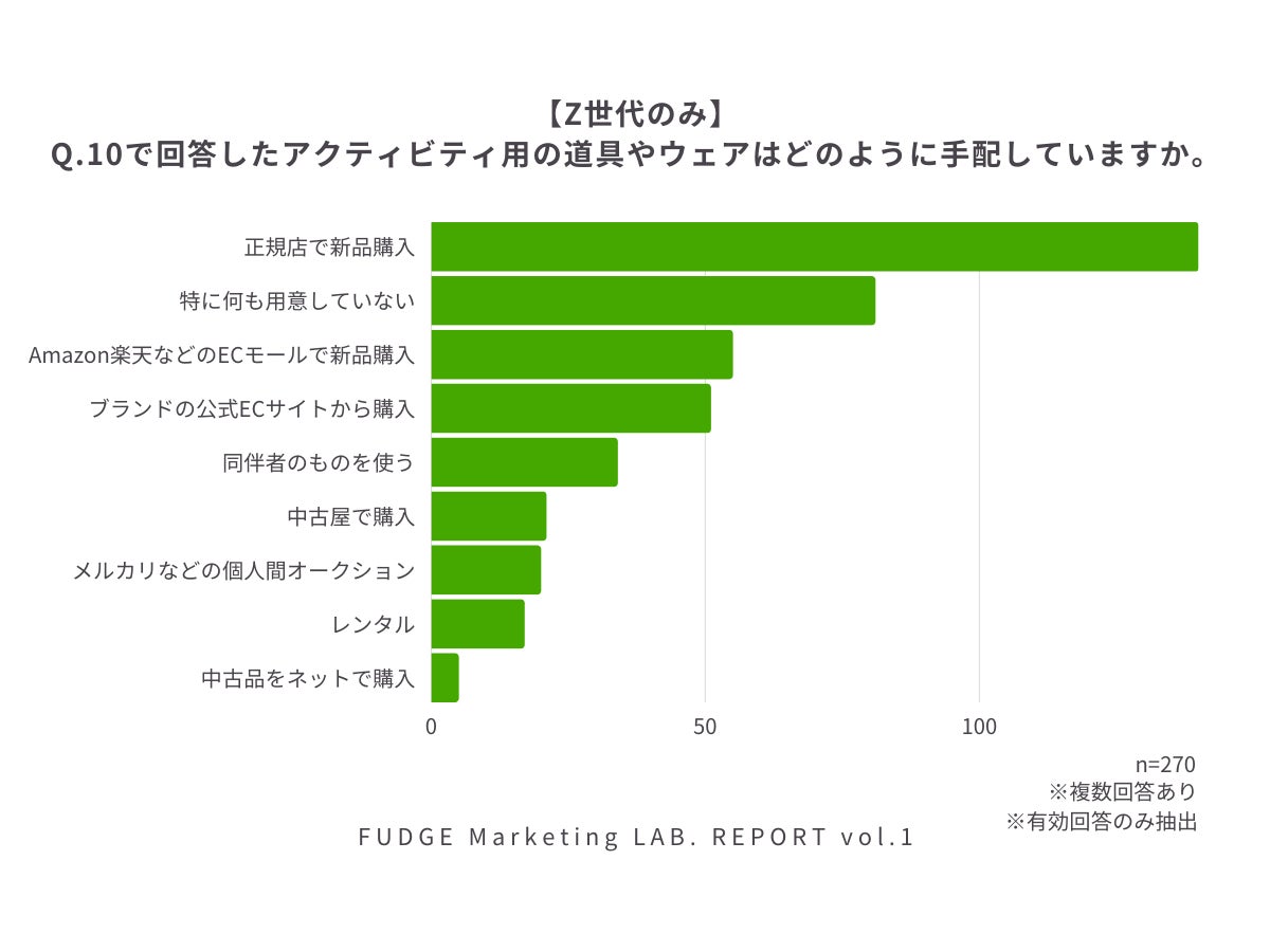 「Q.10で回答したアウトドアアクティビティ用の道具やウェアはどのように手配していますか。」の回答を集計しました。アウトドアアクティビティには、専門のグッズ・ギアが必要なこともしばしば。比較的単価が高くなりやすいアウトドア用のグッズ・ギアですが、FUDGEユーザー(Z世代)では正規店で新品購入派が多い結果となりました。