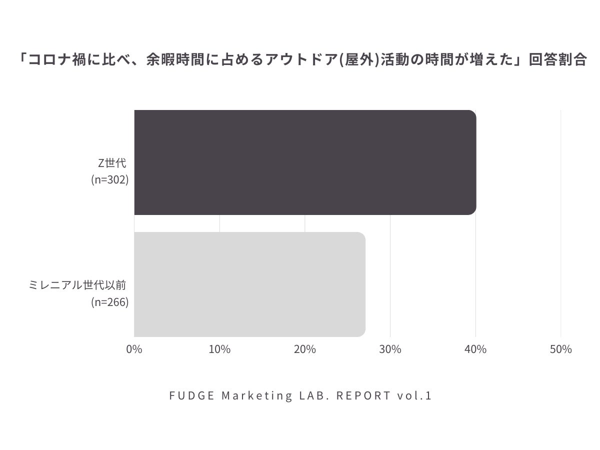すると、Z世代の約40%が「余暇時間に占めるアウトドア活動の時間が増えた」と回答し、ミレニアル世代以前に比べて約13ポイント高い結果となりました。