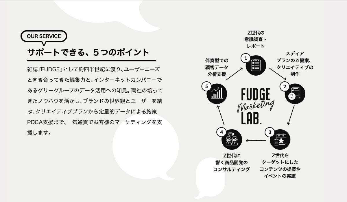 FUDGE Marketing LAB.は、Z世代のファンを多く抱える『FUDGE』のクリエイティブ力とデータマーケティングカンパニーGlossom強みをかけ合わせることで、Z世代のインサイトを読み解いて、企業のプロモーションをサポートします。