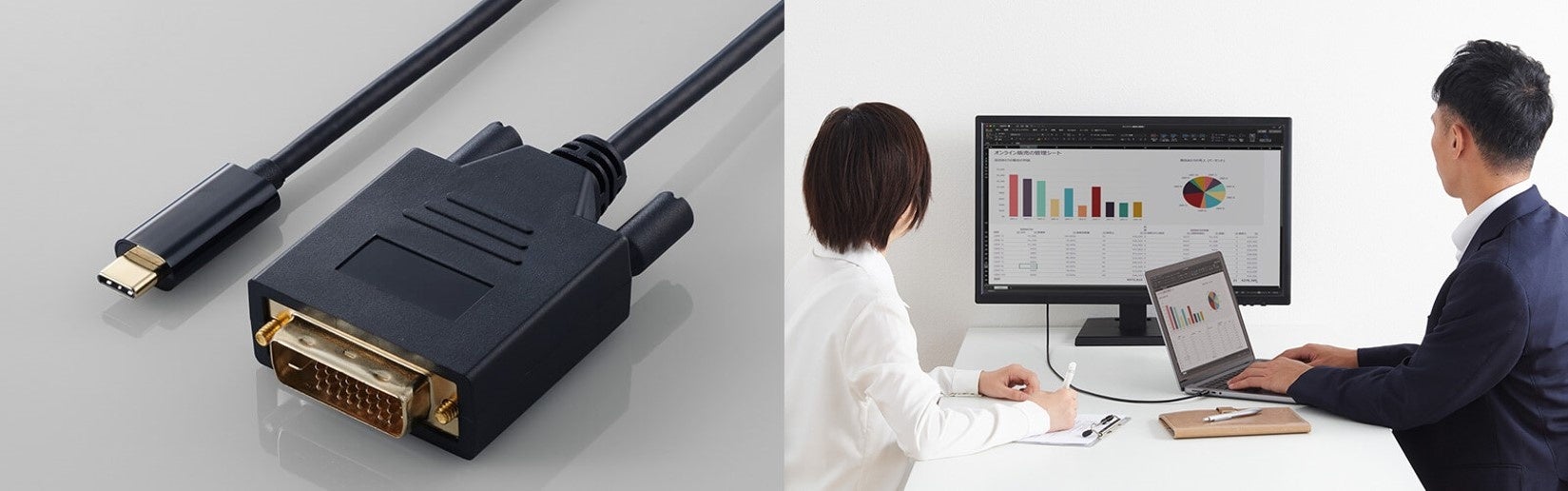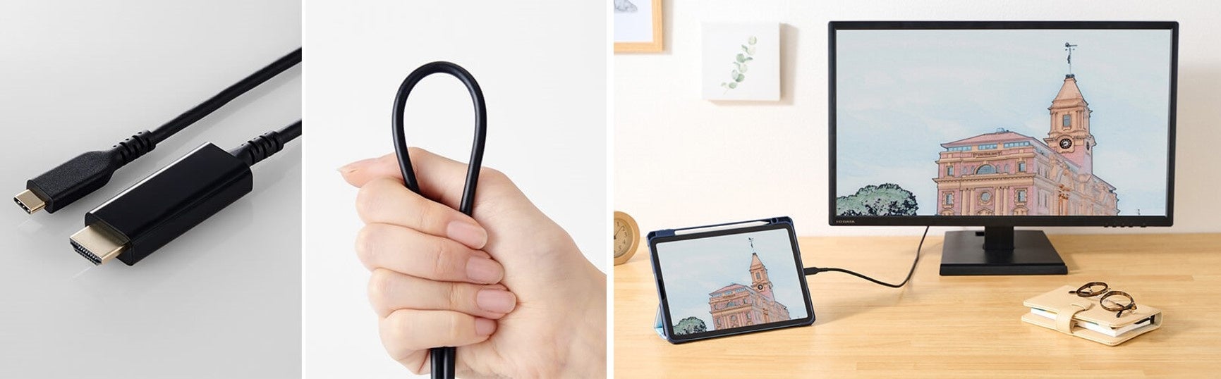 ▲ 写真中央:断線に強い高耐久ケーブルを採用 ▲ 写真右:画面複製と画面拡張2つのモードに対応(条件による)