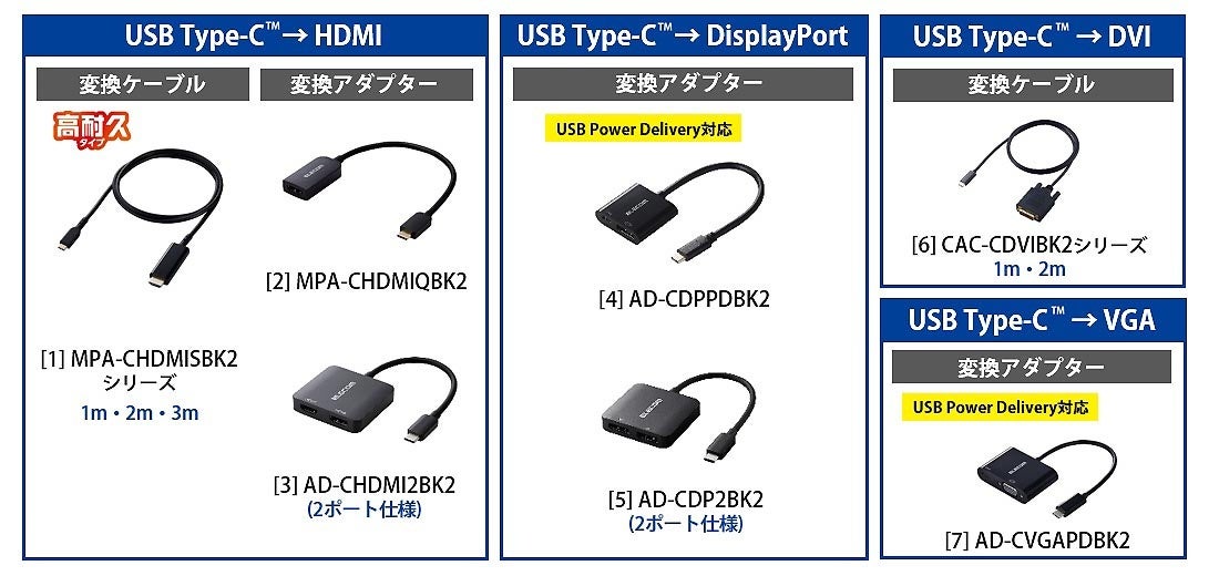 USB Type-C(USB-C)ポートからの映像・音声信号を出力!HDMI/DisplayPort/DVI/VGA端子に変換出力する変換ケーブルと変換アダプター 10アイテムを新発売