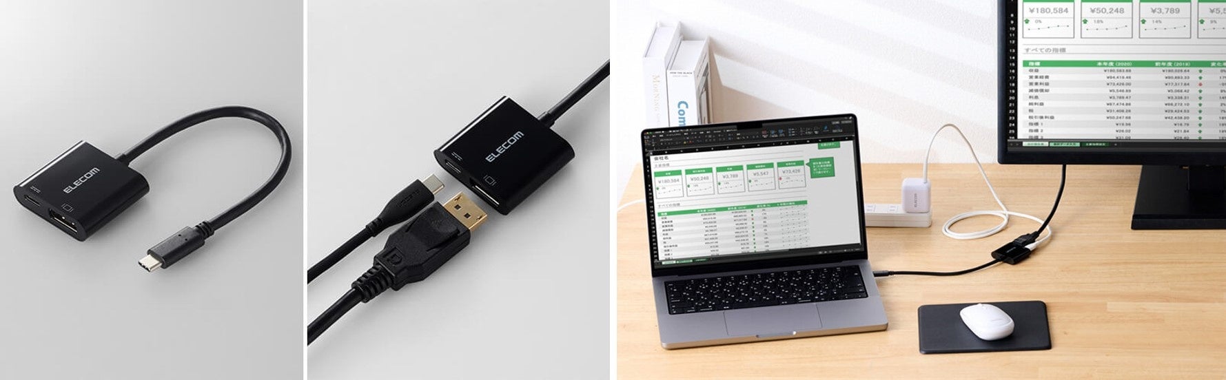 このほか、DVI端子への変換ケーブルと、VGA端子に変換できる、USB Power Delivery対応の変換アダプターもラインアップしています。