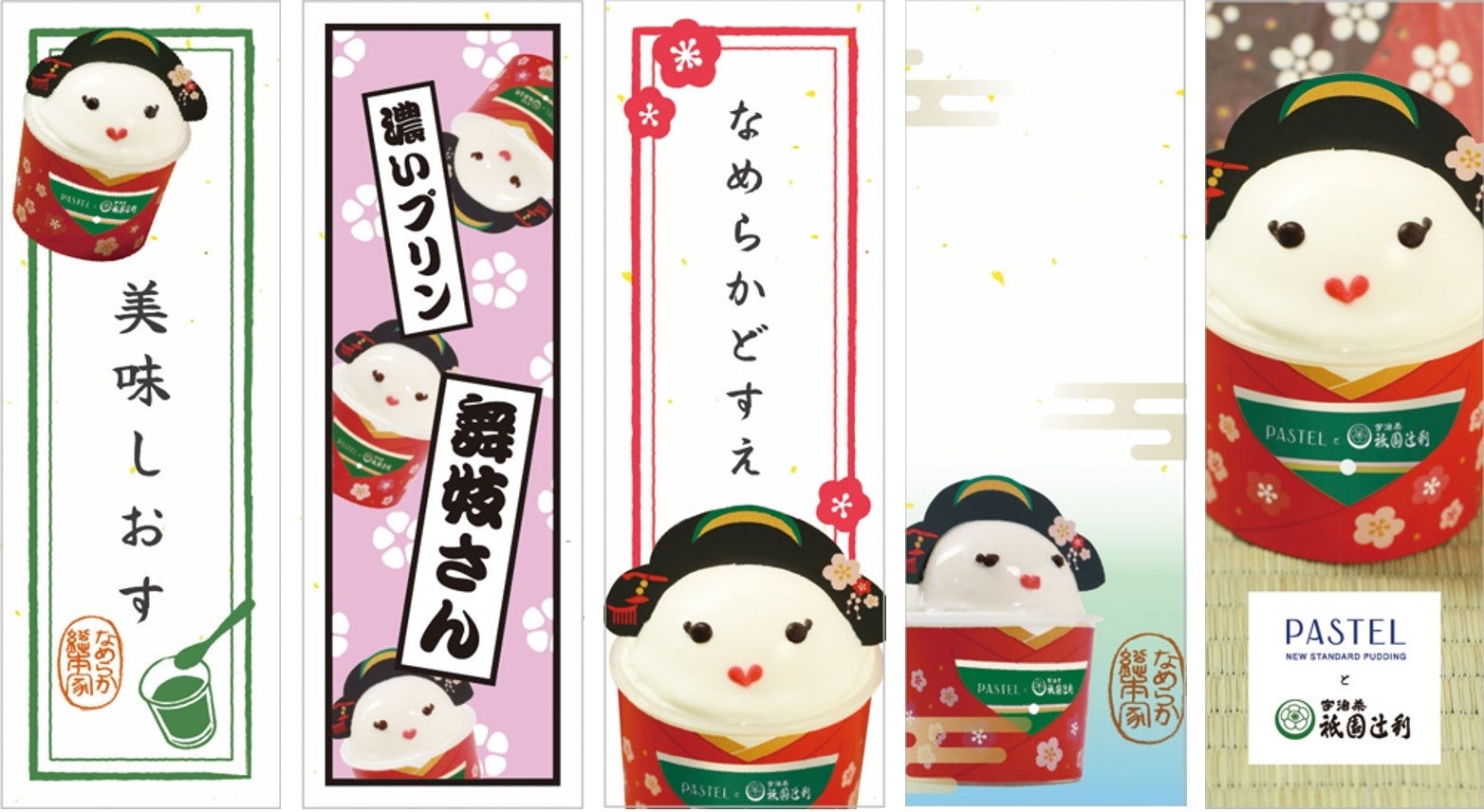 今回「パステル」と「祇園辻利」のコラボレーションを記念して、『濃いプリン 舞妓さん』をデザインした5種類の「パステル」オリジナル「花名刺シール」を制作、「パステル」オリジナル「花名刺シール」3枚(5種類の中から3種類)が付いた『パステルと祇園辻利コラボプリンパック』をご用意いたしました。また、『濃いプリン 舞妓さん』をご購入いただいた方には、先着で「パステル」オリジナル「花名刺シール」を1枚(5種類の中から1種類)プレゼントいたします。