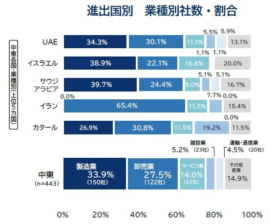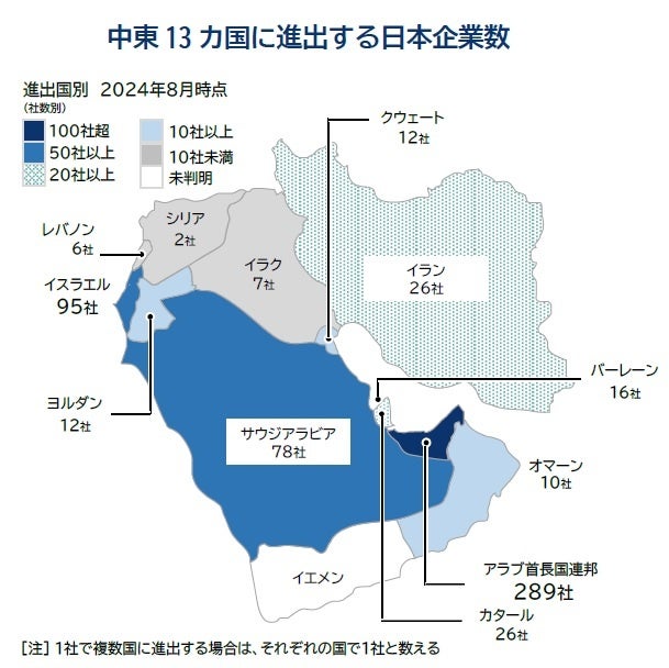 パレスチナを除く中東地域13カ国に進出する日本企業は、2024年8月時点で計443社判明した。進出国別にみると、最も多く進出が判明した国は「アラブ首長国連邦(UAE)」で289社に上った。特に構成国の「ドバイ」「アブダビ」両首長国で進出が多く、現地販売拠点のほか、石油・天然ガス資源の開発など資源関連企業で拠点進出が多くみられた。