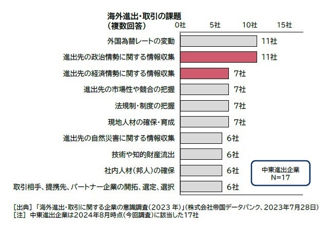 帝国データバンクが2023年に実施した調査では、中東に進出する日本企業で海外進出・取引について回答のあった17社のうち、最も多く挙げられた課題は「外国為替レートの変動」と「進出先の政治情勢に関する情報収集」だった。「経済情勢」に関する情報収集が続き、人材の確保や、言語などカルチャー面での不安が上位だった回答全と比べると、中東進出企業では政治的、特にイラン・イスラエル両国の緊張をはじめ同地域のカントリーリスクに対する警戒感がみられた。