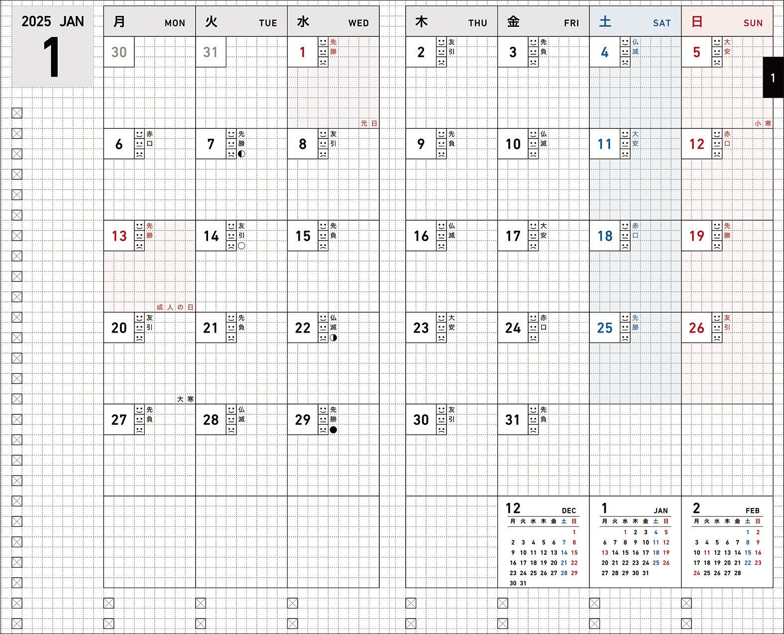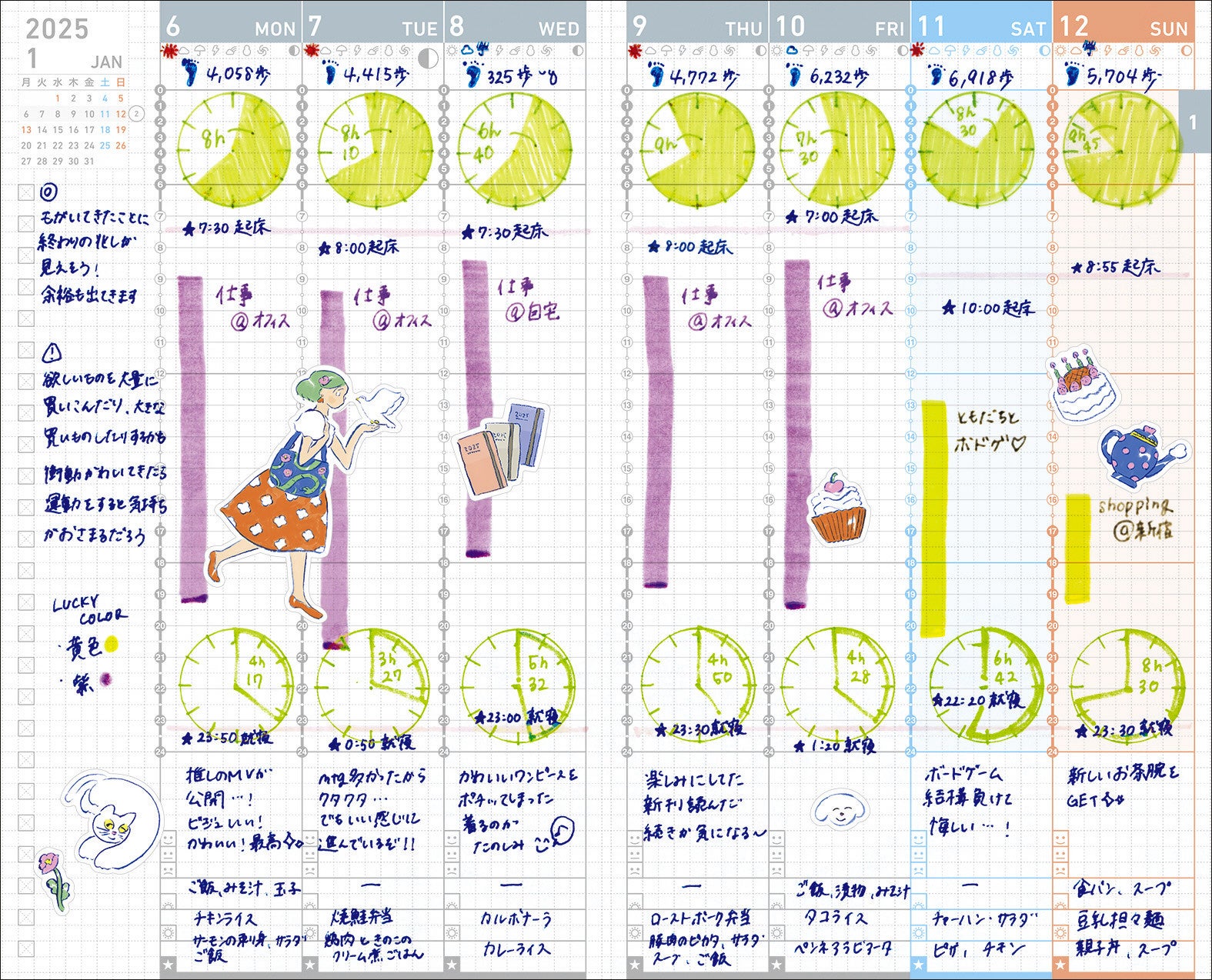 縦軸に24時間軸、横軸に前後の日付と曜日を配した独自のフォーマット「T型タイムライン」を中心に、スケジュール管理だけでなく、1日の食事の記録、運動の記録、3行日記など、1日をたっぷり書き込める「DAYs」。スケジュール管理に加え、日記や趣味の記録などライフログとしてたっぷり書きたいという方に好評です。2025年版では、通年で予定を管理したいというご要望に応え、半年ごとの分冊仕様から単冊仕様にリニューアルしました。