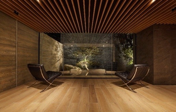 敷地の接する堀川通の由来である堀川や近隣の二条城をモチーフに、天然木や天然石を用いた共用空間を計画。