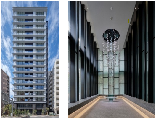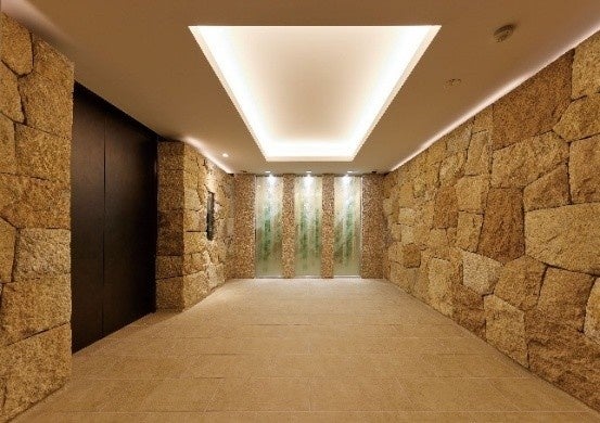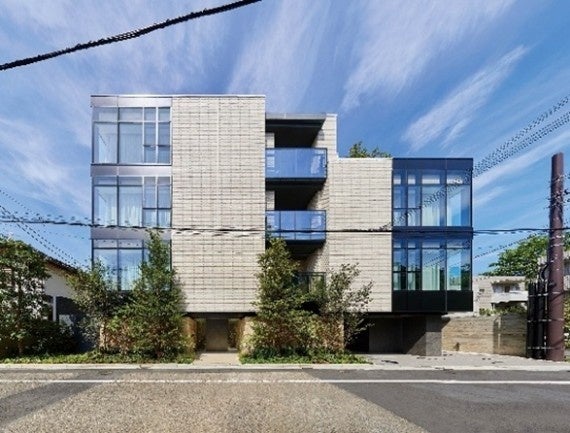成城の歴史と街並みとの調和を重視した、品位ある邸宅である。外観には国産の自然素材を中心に、ガラスやアルミといった現代的な素材を組み合わせ、異なる質感の対比によって奥行きのある表情を生み出している。基壇部には自然石の野面積みを採用し、常緑樹を中心とした植栽が街の緑の景観に寄与している。中層部には白系のタイルを用い、周囲の住宅街と調和する落ち着いた印象を与える。共用部には、日本の縁側文化を現代的に再構築したラウンジを設け、水面を模した石材や流れを表現したガラスアートが、静かな憩いの空間を演出している。駅前の賑わいと邸宅街の静けさが交差する立地にふさわしく、細部にまで配慮された設計は、成城の街並みに自然に溶け込みながらも、さりげない存在感を放っている。過度な装飾を避け、素材の質感や経年変化を活かしたデザインは、長く愛される住まいとしての魅力を備えている。