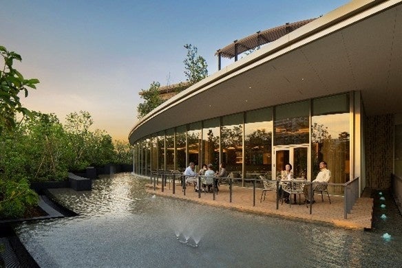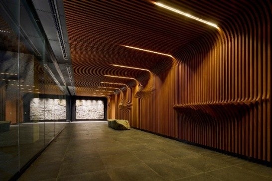 緑と光に包まれる憩いの空間。日本の伝統的な縁側風景を再解釈しデザインしたラウンジを設計。