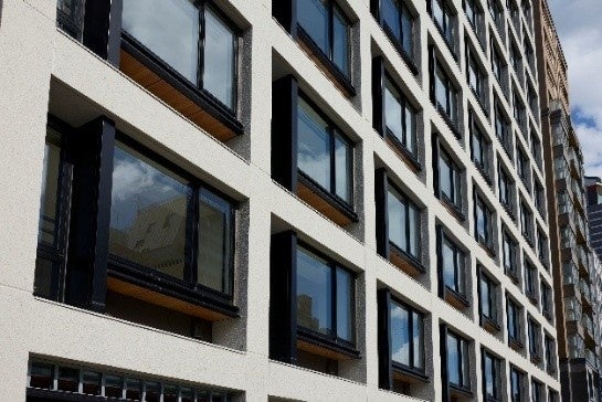 堀川通に面する西面はバルコニーを排除し格子状の構造体と開口部で構築し、新たな現代的デザインを目指した。