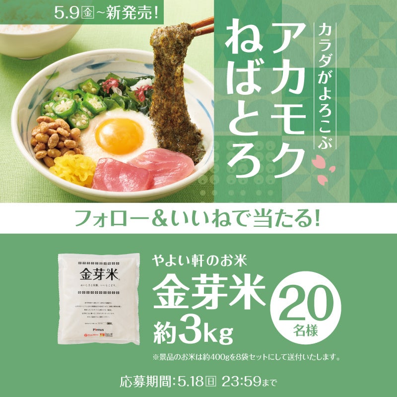 このたび日本国内の「やよい軒」では、やよい軒公式X・公式Instagramにおいて、『アカモクねばとろ定食』発売を記念して、Xでは「やよい軒お食事券」、Instagramではおいしさだけでなく健康にもこだわった「金芽米」が当たる!キャンペーンを実施いたします。