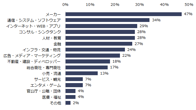 26卒学生にサマーインターンの参加社数を伺うと、一人あたりの平均参加社数は「6.1社」でした。サマーインターンに参加した方に参加した企業の業種を伺うと、トップは47%で「メーカー」。次いで「通信・システム・ソフトウェア」(34%)、「インターネット・WEB・アプリ」(29%)が続きました。