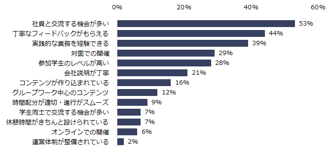 ★ 満足度の高いインターンの特徴、最多回答は「社員と交流する機会が多い」。本選考に進みたくないと思った企業の理由「事業内容に興味が持てなかった」が最多。