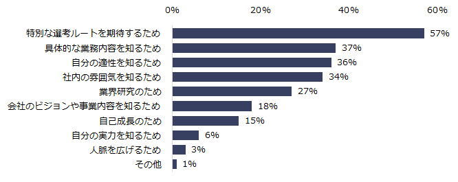 秋・冬インターンの参加予定社数を伺ったところ、一人あたりの平均参加社数は「3.4社」。参加目的についても伺うと「特別な選考ルートを期待するため」(57%)が最多でした。