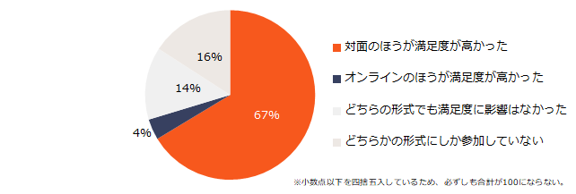サマーインターンに参加した方に、満足度の高かったサマーインターンの特徴を伺うと、トップは「社員と交流する機会が多い」(53%)でした。続けて、本選考に進みたいと思った企業がどのくらいあったか伺うと、99%が「少なくとも1社以上の本選考に進む意向がある」ことが分かりました。(一部の企業:27%、半分以上の企業:55%、すべての企業:17%)また、実施形式が満足度に影響したかについて伺うと67%が「対面のほうが満足度が高かった」と回答しました。