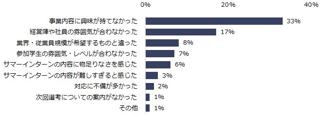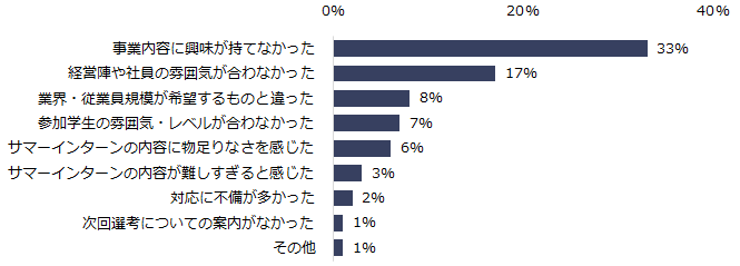 一方で、本選考に進みたくないと思った企業の理由を伺うと、「事業内容に興味が持てなかった」(33%)が最多でした。