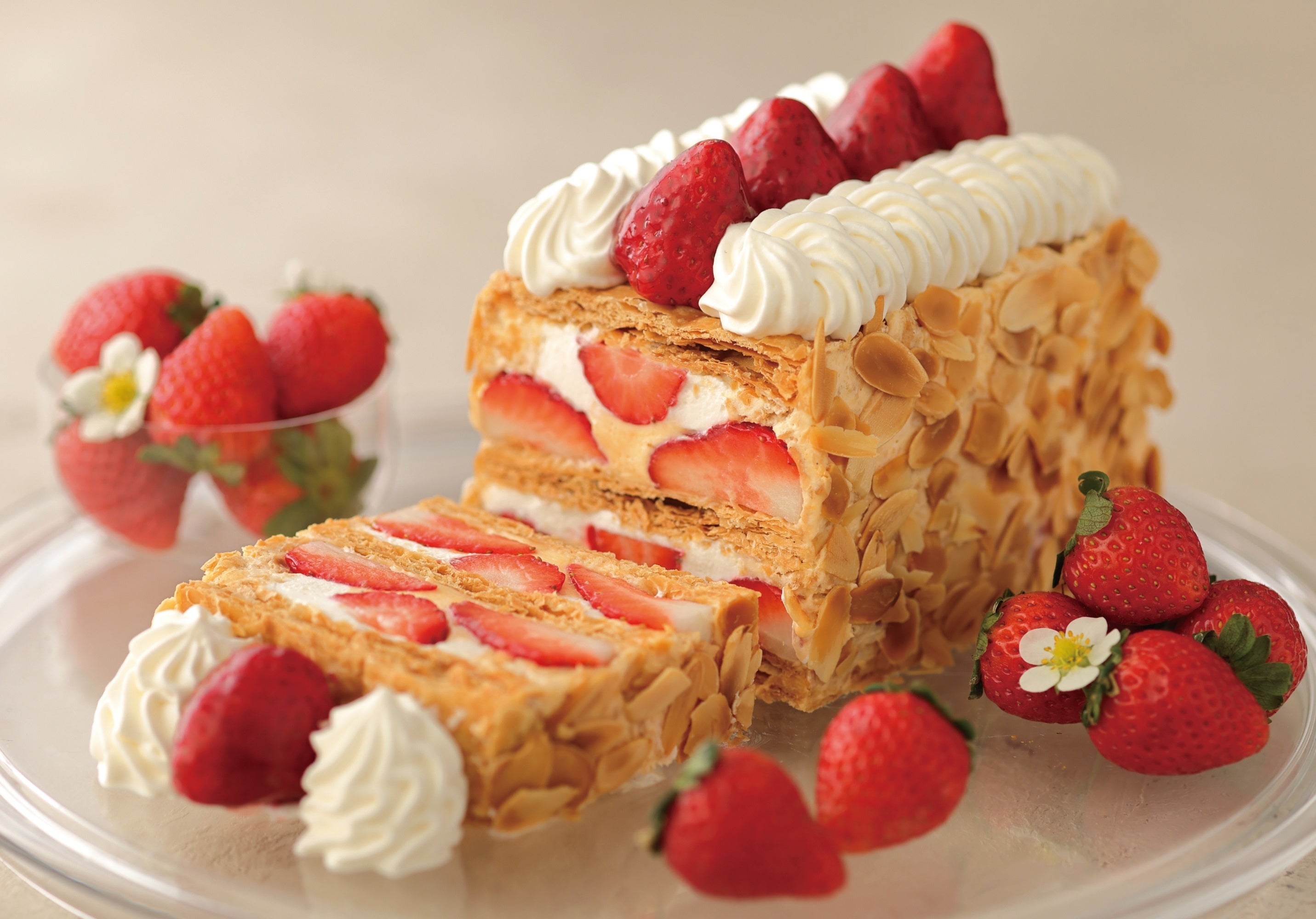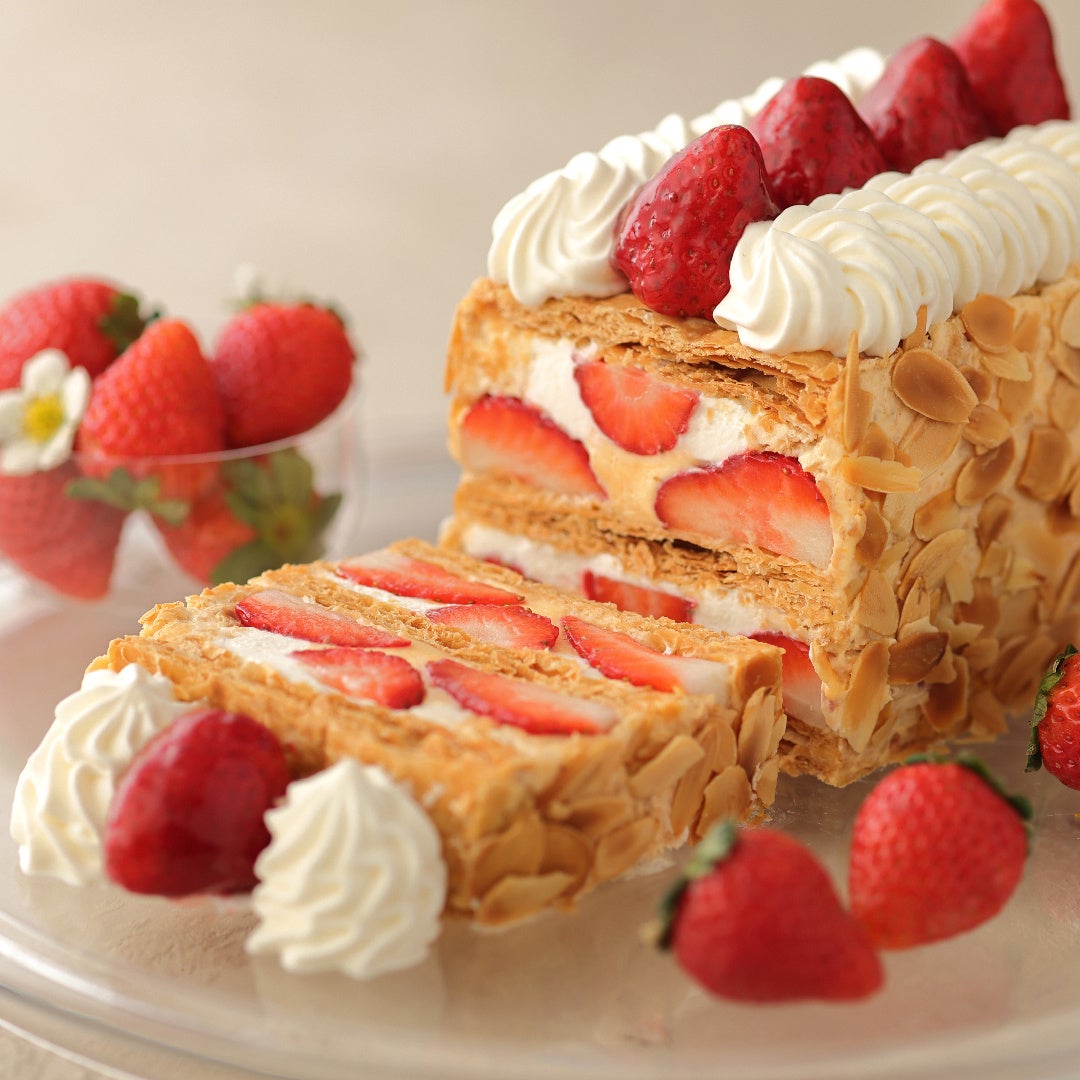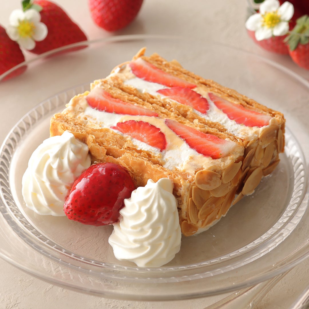 サクサクのパイ生地で、苺とクレーム・シャンティ、ディプロマットクリームを重ね合わせることで生まれる酸味と甘み、パイ生地の食感による絶妙なバランスが特徴です。