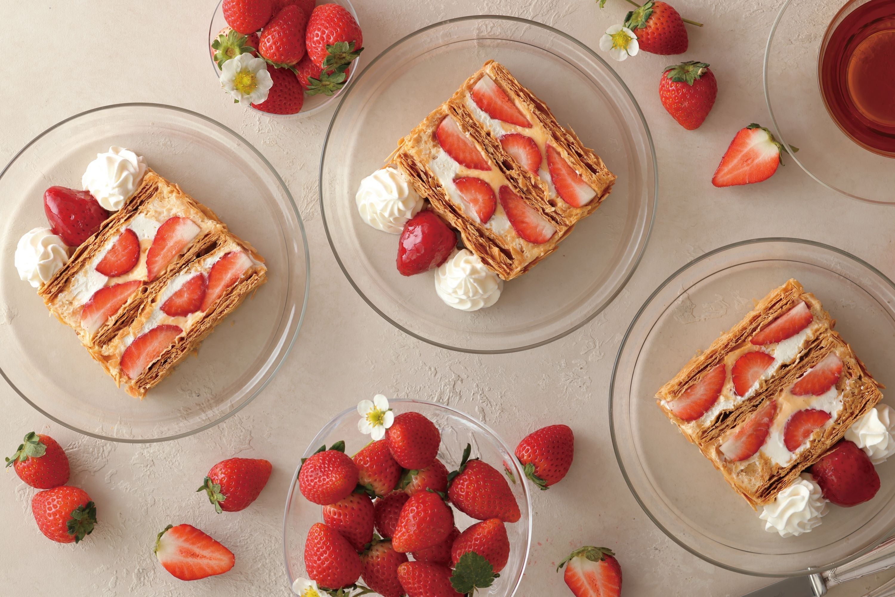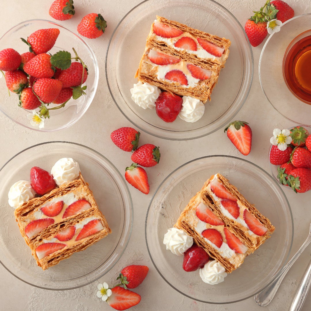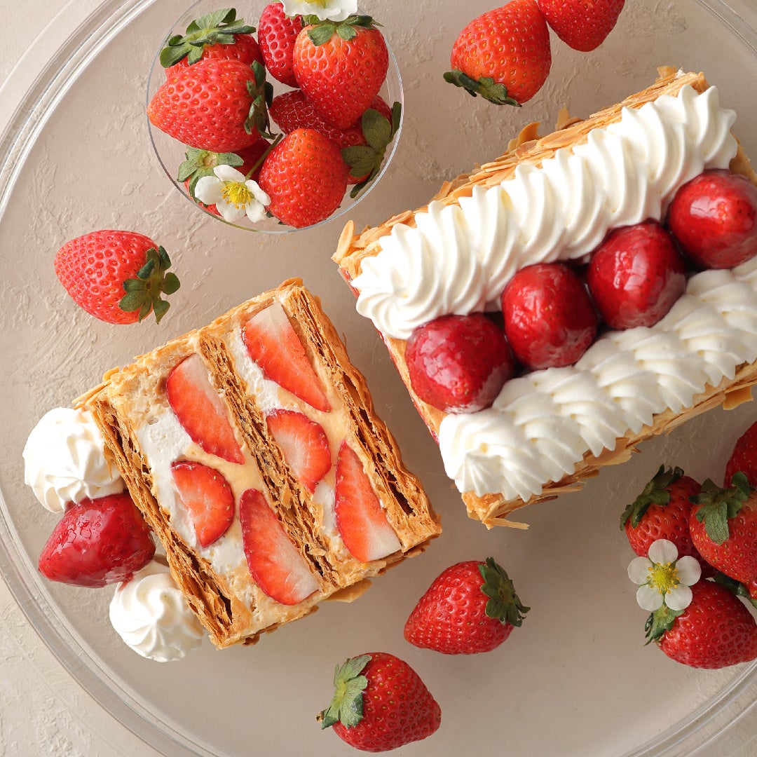 サクサクのパイ生地で、苺とクレーム・シャンティ、ディプロマットクリームを重ね合わせることで生まれる酸味と甘み、パイ生地の食感による絶妙なバランスが特徴です。