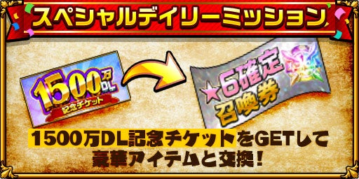 期間中毎日開催されるミッションをクリアすると、「1500万DL記念チケット」が手に入ります。