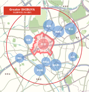 「Greater Shibuya(広域渋谷圏)」とは、東急グループの渋谷まちづくり戦略において定めた、渋谷駅半径2.5kmのエリアのことを指します。「働く」「遊ぶ」「暮らす」が融合した持続的に成長する都市圏を目指します。