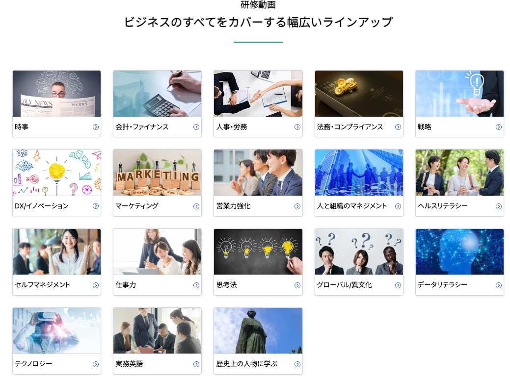 ビジネスマスターズ®は、ビジネス誌と専門書の両方の要素を兼ね備えたまったく新しい講座が満載です。ビジネスの基本知識、効果的なコミュニケーション、職場のトラブル解決法、最新ビジネストレンドを、人気講師のレクチャーやドラマで楽しみながら学べる豊富な講座をご用意しております。集合研修やバーチャルクラス研修の事前学習に最適な講座も充実。成長志向のビジネスパーソンを支援するとともに、企業の教育研修の効果をさらに高めます。